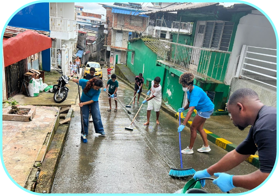 En Buenaventura trabajamos con niñas, niños, adolescentes y jóvenes para reducir la violencia y crear entornos protectores. A través de talleres y visitas domiciliarias, atendemos a sus familias y formamos a madres consejeras. Además, acompañamos a una institución educativa donde formamos docentes y estudiantes. Para ampliar nuestra esfera de influencia, participamos en espacios de incidencia y nos reunimos con lideresas comunitarias. También involucramos a nuestras vecinas y vecinos en acciones comunitarias como la limpieza del barrio o la restauración de la cancha.